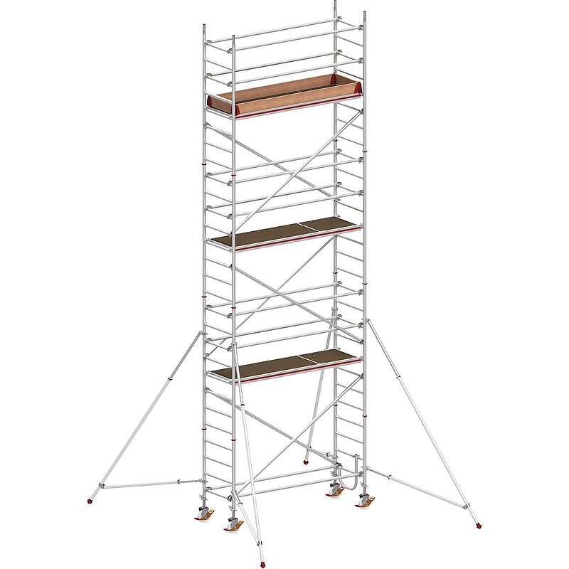 Hymer Fahrgerüst mit Ausleger 8771. Extrem robuste Ausführung durch geschweißte Rahmenteile. Schneller Auf- und Abbau durch Klickverschlüsse an Streben und Diagonalen.Komfortables Auflegen von Diagonalen und Bühnen auf der selben Sprosse des Rahmenteils. Rutschsicherer Belag auf Bühnen und manueller Sicherheitshaken für sicheres Auf- und Abbauen. Bequemes Ausgleichen von Bodenunebenheiten dank höhenverstellbarer Lenkrollen. Optionaler Aufbau mit Höhenversatz.