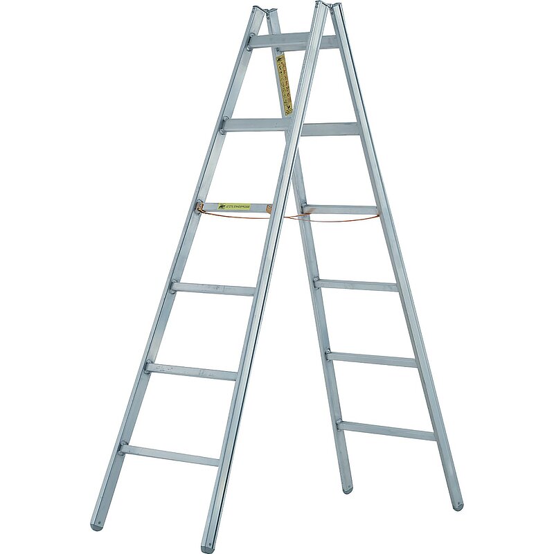 Stehleiter aus doppelwandigem Profil, starke Aluminiumgelenke. Die obersten zwei Sprossen bestehen aus Ovalrohr mit 320 mm Sprossenabstand für bequemen Stand in der Grätsche, reißfeste Gurtbänder als Spreizsicherung. Sprossenabstand 300 mm. Tragkraft 150 kg.