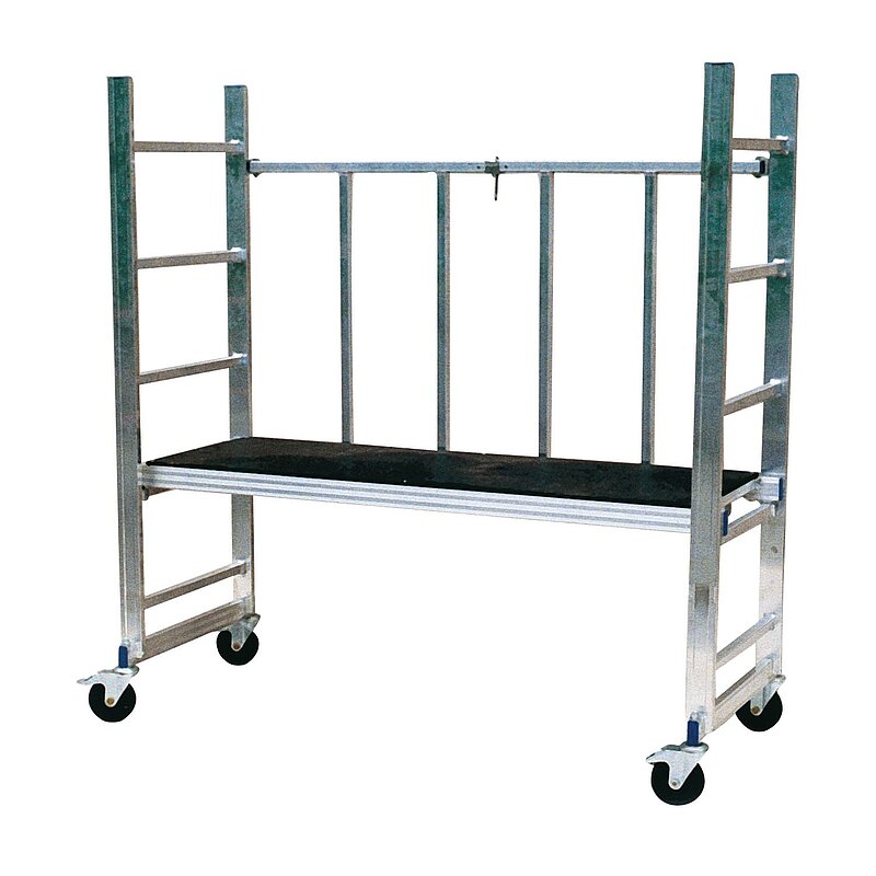 Praktisches Kleingerüst für Handwerker, komplett aus Aluminium, Alu-Bühne mit geriffeltem Visatec-Belag, wasserfest und rutschhemmend, alle 300 mm höhenverstellbar, Bühne im zusammengeklappten Zustand des Gerüstes senkrecht einhängbar. Tragkraft: 150 kg.
