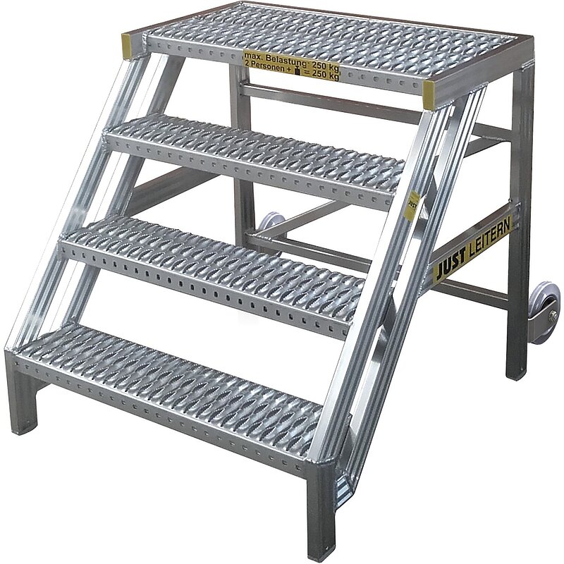 Stufen und Plattform aus Aluminium-Graepelrost (extrem rutschhemmend), Stufentiefe 240 mm, Neigung 45 Grad, Stützteil 5 Grad schräg ausgeführt, am unteren Ende mit Kunststoffschuhen, am Stützteil mit Hilfsräder.