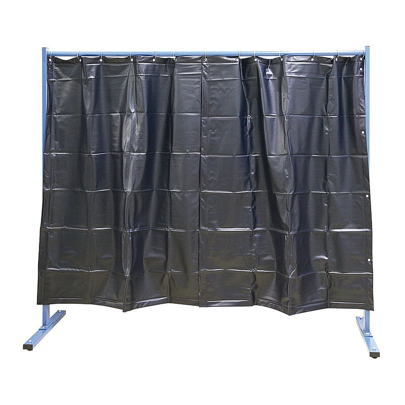1-teilige Schutzwand mit Folienvorhang. Stabiles Gestell aus Vierkantrohr mit grauer Epoxy-Pulverbeschichtung. Die 0,4 mm starke Folie wird mit Metallhaken am oberen Rohr befestigt. Breite 2,10 m,