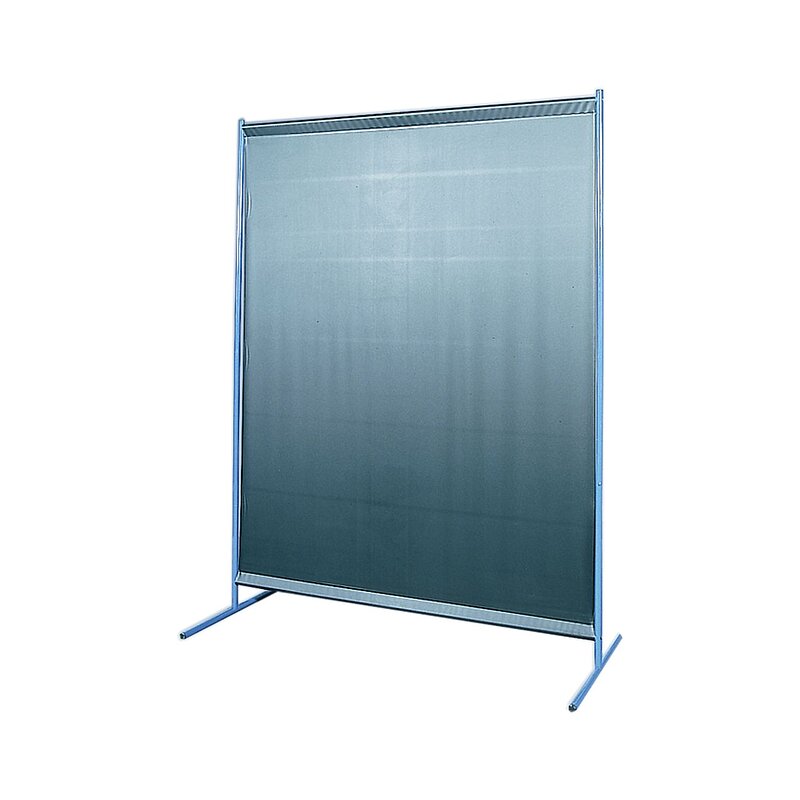 1-teilige Schutzwand mit Folienvorhangbespannung. Leichtes Stahlrohrgestell aus Rundrohr mit grauer Epoxy-Pulverbeschichtung. Die 0,4 mm starke Folie wird zwischen die obere und untere Querstrebe des Gestells gespannt.