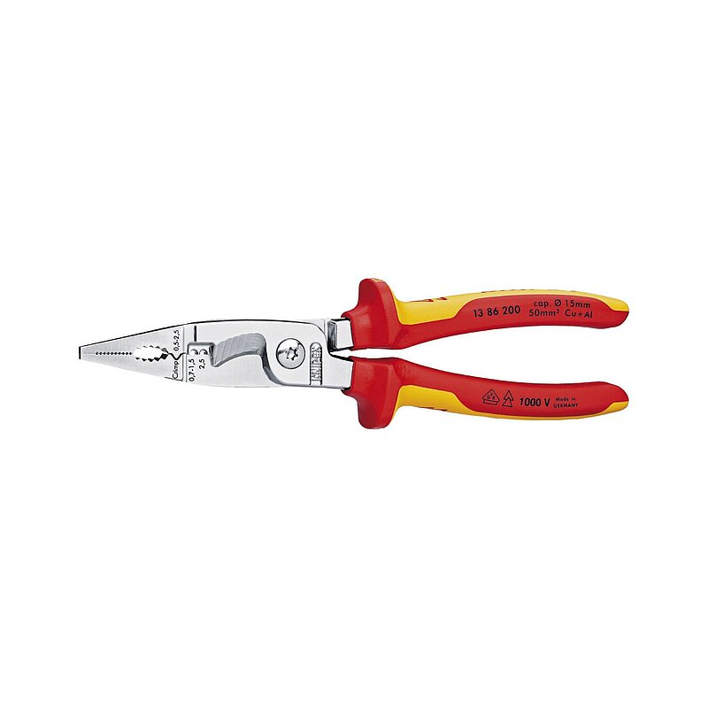 6 Funktionen in einer Zange. Multifunktionszange für die Elektroinstallation- zum Greifen von Flach- und Rundmaterial, Biegen, Entgraten, Kabelschneiden, Abisolieren und Crimpen von Aderendhülsen. Glatte Greifflächen an der Spitze für ein beschädigungsfreies Greifen von Einzeladern- profilierte Greifflächen und Brennerloch zum Greifen von Flach- und Rundmaterial. Markante Außenkante an der Backe zum Bearbeiten von Unterputzdosen und Entgraten von Durchführungslöchern. Abisolierlöcher für Leiter 0,75 - 1,5 mm² und 2,5 mm². Crimpnest für Aderendhülsen 0,5 - 2,5 mm². Kabelschere mit Präzisionsschneiden (induktiv gehärtet) für Cu- und Al-Kabel bis 5 x 2,5 mm² / Ø 15 mm. Greifen, ohne die Zange vollständig zu öffnen (intelligenter Zuhaltemechanismus bei der Version mit Öffnungsfeder). Die Schneide bleibt geschlossen und geschützt. Schlanke Bauform für gute Zugänglichkeit. Geschraubtes Gelenk: präziser, spielfreier Gang der Zange.