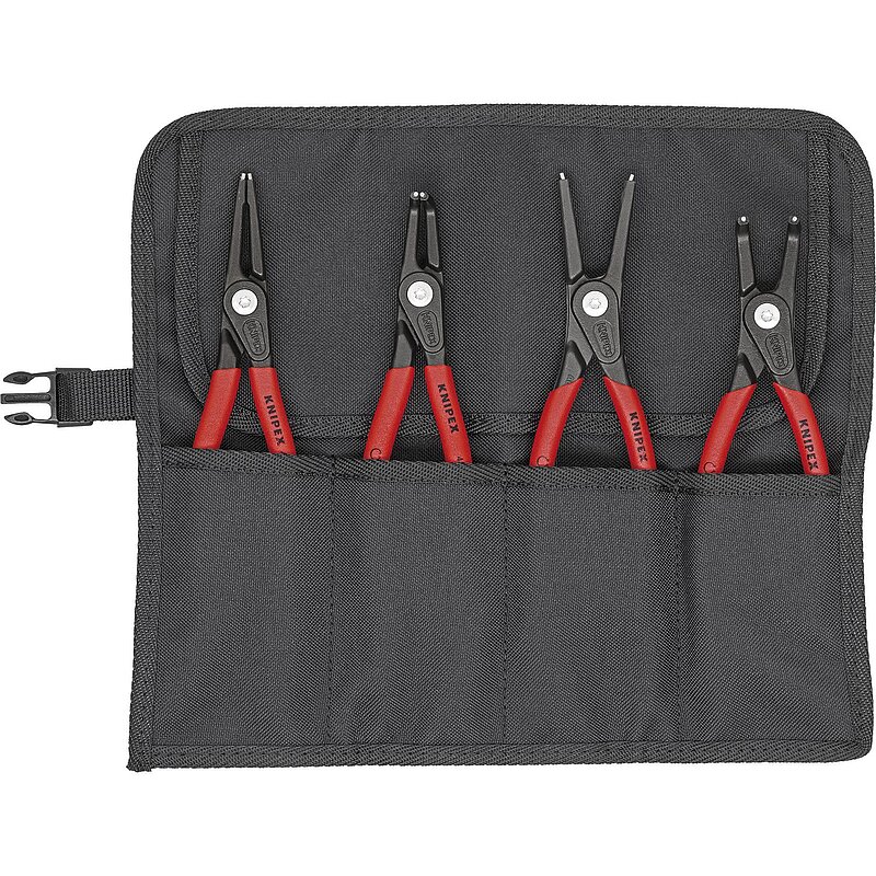 Gängige Präzisions-Sicherungsringzangen für Innen- und Außenringe. In Rolltasche aus strapazierfähigem Polyester-Gewebe, mit praktischem verstellbarem Schnellverschluss.