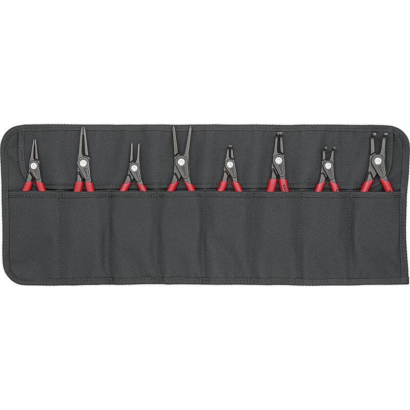Gängige Präzisions-Sicherungsringzangen für Innen- und Außenringe. In Rolltasche aus strapazierfähigem Polyester-Gewebe, mit praktischem verstellbarem Schnellverschluss.