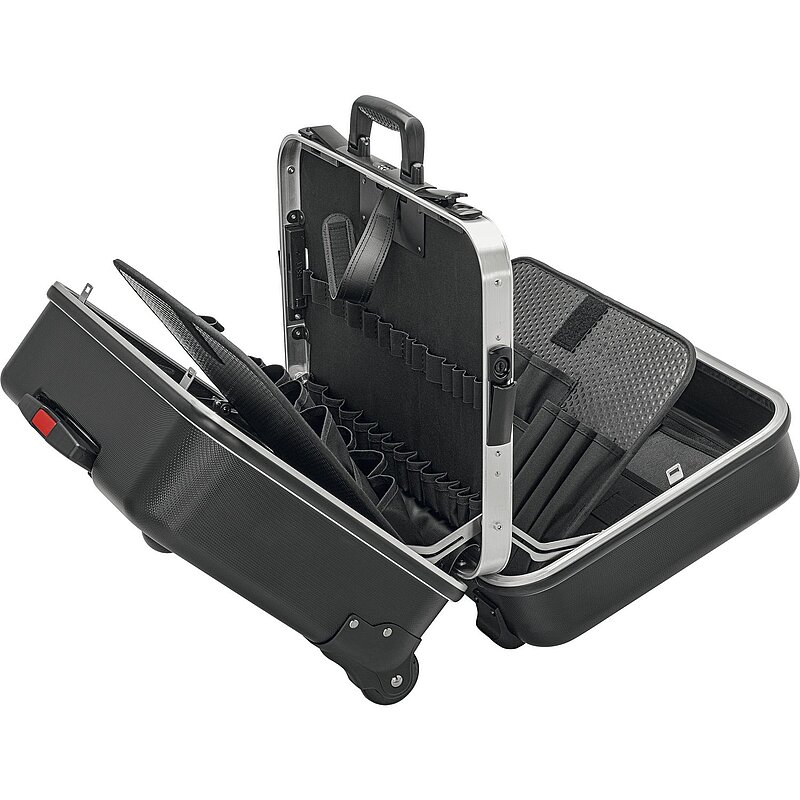 Strapazierfähige Ausführung aus ABS-Material, Farbe schwarz. Umlaufender Aluminium-Rahmen und fest montierte, stabile, beidseitig bestückbare Mittelwand mit vielseitigen Einsteckmöglichkeiten durch elastische Schlaufen und 12 kleine Taschen. Im Boden eingelassener Ausziehgriff sowie zwei außen liegende, leicht laufende Skater-Rollen. Ein- oder beidseitig zu öffnen (V-förmig), Boden und Deckel lassen sich voneinander unabhängig teil- oder vollöffnen. Frei stehend in allen Öffnungslagen. Spezielle Kufen schonen den Fussboden und sorgen für sicheren Stand. Abschließbar. Herausnehmbares Dokumentenfach und herausnehmbare Werkzeugtafel mit 13 Werkzeugtaschen. Bodenschale Höhe 60 mm, flexibel durch Trennstege unterteilbar. Werkzeugtafel als Abdeckplatte mit 13 Werkzeugtaschen. Belastbarkeit bis 30 kg.