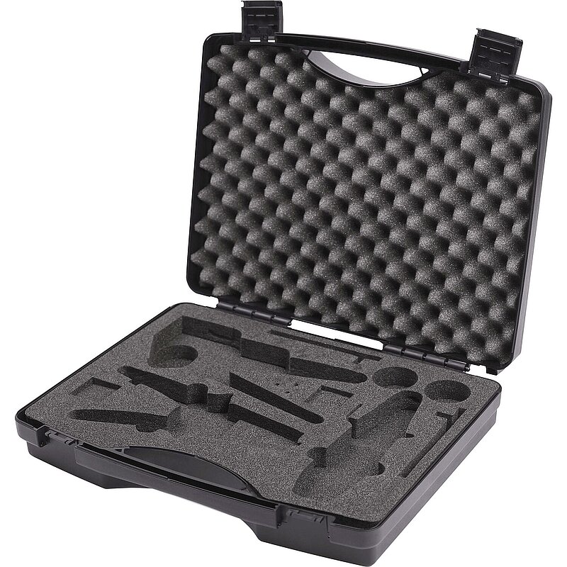 Schaumstoffeinlage mit Mulden für die Aufnahme der Werkzeuge, für Crimpeinsätze und Positionierhilfen. Schlagfester Kunststoffkoffer.
