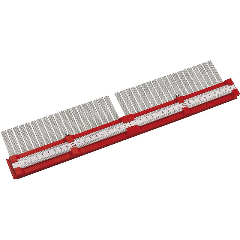 Diese Konturenlehre ist 150 mm bzw. 200 mm lang, wobei die 200 mm lange Version unbegrenzt aneinander gesteckt werden kann, um lange Profile bzw. Konturen abtasten zu können. Dadurch ergibt sich für den Fachmann beim Konturenübertragen eine erhöhte Genauigkeit und Zeitersparnis. Der beiliegende Stellwinkel, seitlich zugesteckt, lässt die Schablone nach allen Richtungen nachstellen. Bei größerer Verformung des Profils können die Nadeln über die Mitte der Halterung hinaus nachgezogen werden.