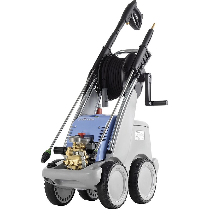 Lieferung inkl. Reinigungsmittelansaugung, Feststellbremse, Schlauchtrommel mit 20 m Stahlgewebe-Hochdruckschlauch DN6, Sicherheitsabschaltpistole M 2000, Schmutzkillerlanze mit Edelstahlrohr, Flachstrahllanze mit Edelstahlrohr, 7,5 m Anschlusskabel mit Kabelaufwicklung.