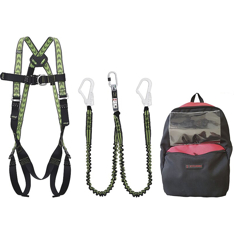 Zweipunktauffanggurt, davon 1 Verankerungspunkt mittig am Brustgurt, D-Ring für Auffangsysteme mit 3 Schnellverschluss-Schnallen. Y-Verbindungsmittel aus elastischem Gurtband mit Falldämpfer und Stahlkarabiner mit Schraubverschluss an einem Ende sowie 2 Gerüsthaken an den beidenanderen Enden.