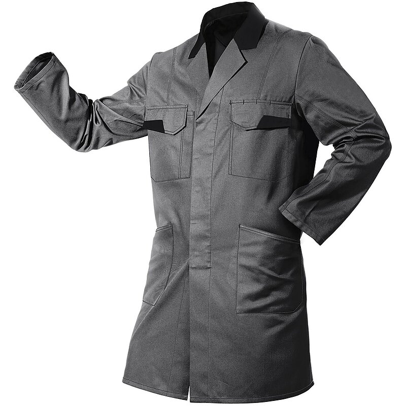 2 Brusttaschen mit Patte und verdecktem Druckknopf, links in veredelungsfreundlicher Verarbeitung. Rechts: Stifttasche und Smartphonetasche mit Klette. Links: 3 Stiftfächer. 2 aufgesetzte Seitentaschen, Ergonomisch geformte Ärmelnähte, Blende mit Druckknöpfen, Rücken mit Bequemlichkeitsfalten, Angenähter Rückengurt, Seitenschlitze, Leasingkoller. Belastungspunkte mit Riegeln gesichert. Neue Schulterpassenoptik. Kontrast-Elemente: Pattenaufsatz an Brusttaschen, Kragen, Innenbelag Bequemlichkeitsfalten, Kontraststepp.
