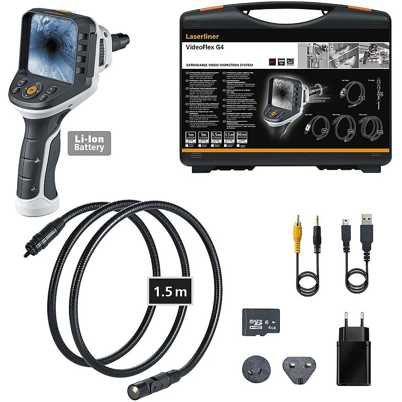 Das professionelle Videoinspektionssystem ermöglicht visuelle Kontrollen an schwer zugänglichen Stellen, beispielsweise in Rohrleitungen, Wandhohlräumen und Kraftfahrzeugen. Der Anwender hat eine einfache räumliche Orientierung durch intuitives Drehen der Basiseinheit. Mit effektiver LED-Objektbeleuchtung gelingen selbst unter schlechten Bedingungen aussagekräftige Aufnahmen. Der Kamerakopf mit einem stufenweise verstellbaren Schwenkbereich von 180° ermöglicht optimales Anpassen an den Einsatzort. Aufgrund einer naturtreuen Wiedergabe von Farben wird eine realitätsnahe Darstellung geboten. Details lassen sich über die Zoom-Funktion klar erfassen. Das ergonomisch designte Gerät liegt gut in der Hand und ist auch bei längeren Arbeiten angenehm zu nutzen. Acht verfügbare Sprachen und die wechselbare Kameraeinheit sorgen für vielfältige Einsatzmöglichkeiten. Eine SD-Speicherkarte dient zur Dokumentation und die USB-C-Schnittstelle zum Auswerten der Bilder und Videos.