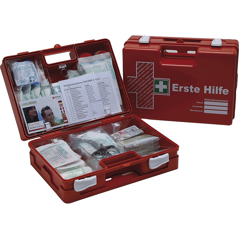 Inhalt nach Önorm Z 1020 : 2025, welche die Anforderungen von Verbandmaterialien für Arbeitsstätten und Betriebe festlegt bzw. deren Inhaltskomponenten definiert. Steril verpacktes Verbandsmaterial ist 5 Jahre haltbar. Danach ist nicht mehr garantiert das es noch steril ist. ABS-Kunststoff, schlagfest und bruchsicher mit Gummidichtung und Wandhalterung. Transparente Abdeckplatten zum Schutz der Füllteile, variable Inneneinteilung durch Trennstege, plombierbar, inkl. 1 Arretierung.