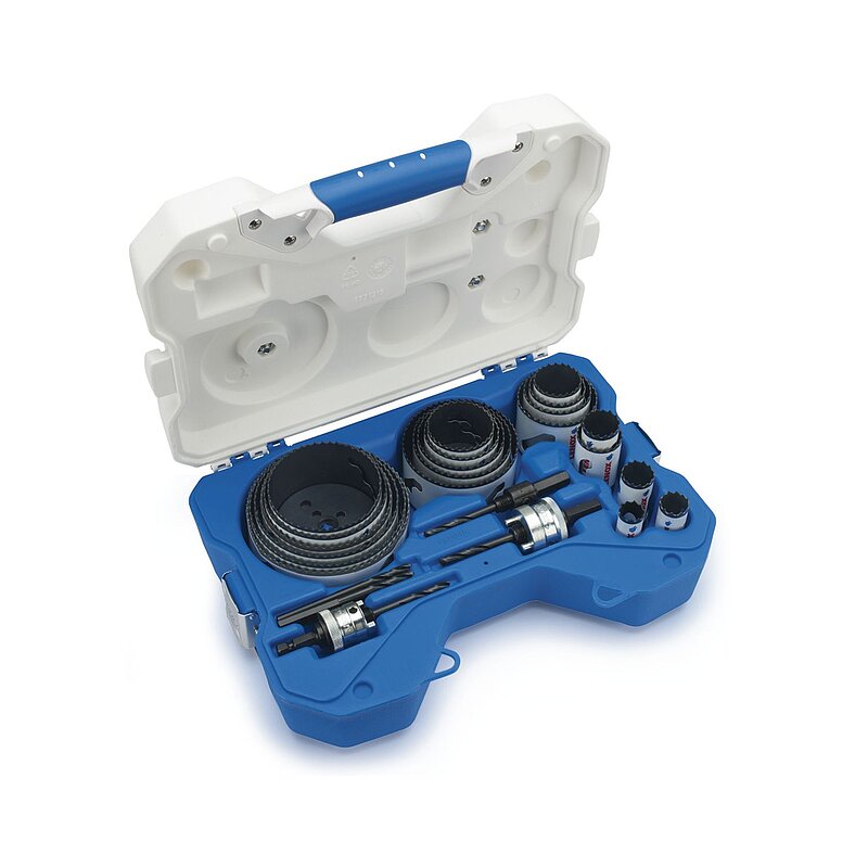 Inhalt: Lochsägen Gr. 19 / 22 / 25 / 29 / 35 / 38 / 44 / 51 / 54 / 57 / 64 / 68 / 76 / 83 / 86 / 92 / 95 / 105 / 114 / 121 mm, 2 Lochsägenschäfte, 3 Ersatzführungsbohrer.