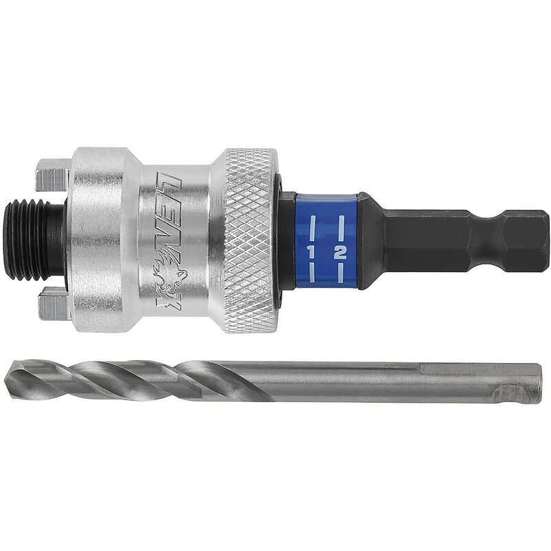 Lochsäge und Zentrierbohrer lassen sich ohne Werkzeug schnell und leicht mit nur einer Hand befestigen/ lösen. Verhindert das Festziehen der Lochsäge im Halter. Der Kragen ist während des Bohrens eingerastet. Arretierungszapfen schützen Gewinde vor Verschleiß und garantieren den richtigen Sitz der Lochsäge und des Zentrierbohrers. Lochsägenhalter passt direkt auf Lochsägengewinde. Kompatibel mit gängigen Lochsägen. Für ein schnelles Arbeiten ohne Verlaufen und ohne Ankörnen. Zentrierbohrer mit spezieller Nut, die den Wechseln in Kombination mit dem LENOX SNAP-BACK Halter ohne Werkzeug ermöglicht. Die Bohrer sind auch kompatibel mit konventionellen Standard-Haltern mit 1/4"-Schaft.