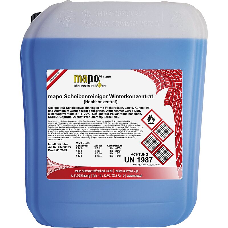 mapo Scheibenreiniger Winterkonzentrat ist ein konzentrierter Zusatz für die Scheiben-waschanlage. Es verhindert das Einfrieren der Waschflüssigkeit bei Frost und entfernt Schmutz mühelos im winterlichen Straßenverkehr, gibt auch klare Sicht im Sommer.
