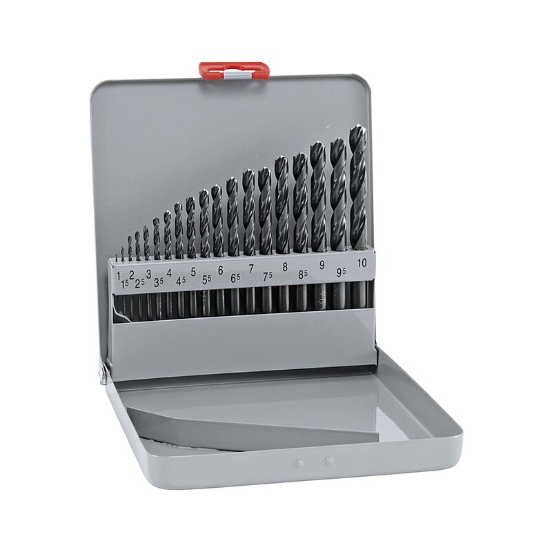 Kassette aus Stahlblech, lackiert. Spiralbohrer präzisionsgeschliffen mit Zylinderschaft. Industriequalität zum Bohren von legierten und unlegierten Stählen, Grauguss, Temperguss, Kupferlegierungen, Neusilber, Graphit, Sintereisen. Kein Ankörnen erforderlich, durch Spezialanschliff, rasche Spanabfuhr durch oxidbeschichtete Spiralnut. ø um 0,5 mm steigend.