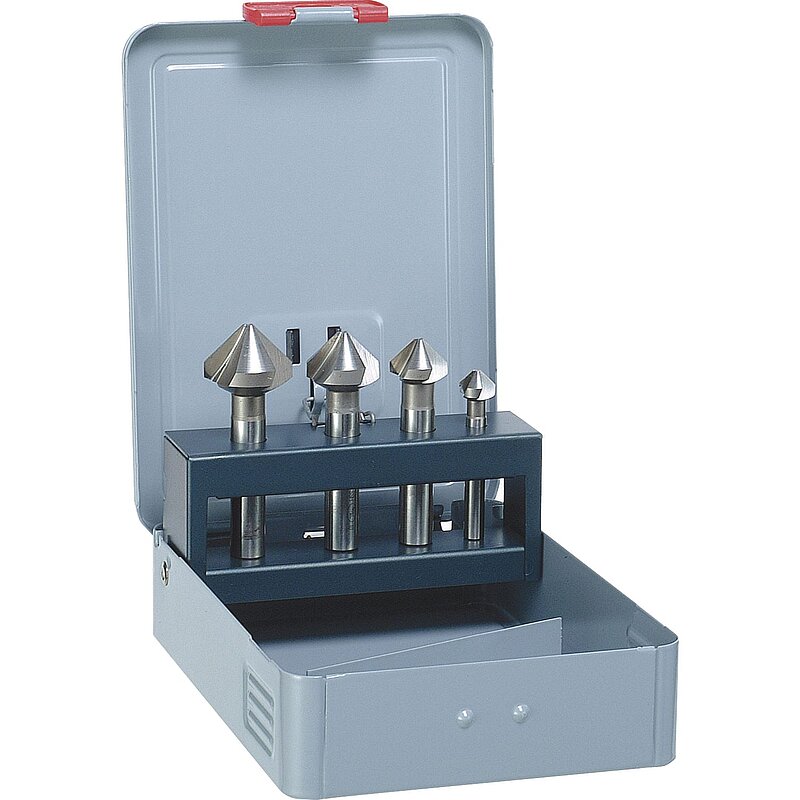 Bestückt mit Kegelsenkern HSS Co5 für alle E- und NE-Metalle, Kunststoffe hart und weich. Für VA- und rostfreie Stähle. In Metallkassette.