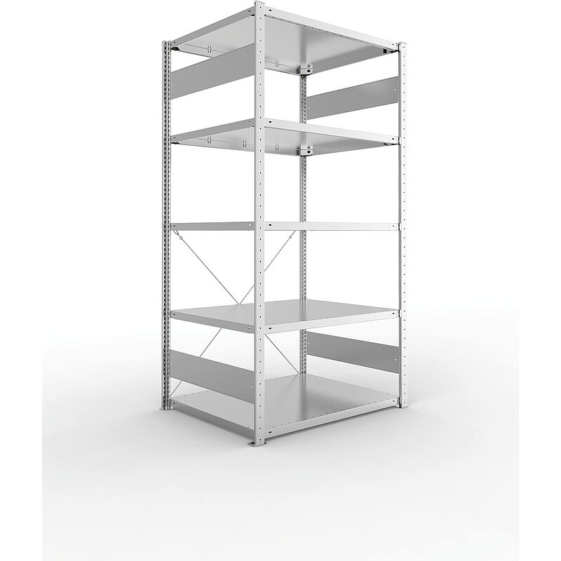 Die Rahmen werden aus bandverzinktem Qualitätsstahlblech gefertigt. Für die einfache und schnelle Steckmontage. Größen individuell anpassbar. Fachböden im Raster von 25 mm verstellbar für die variable Anpassung an das Lagergut.