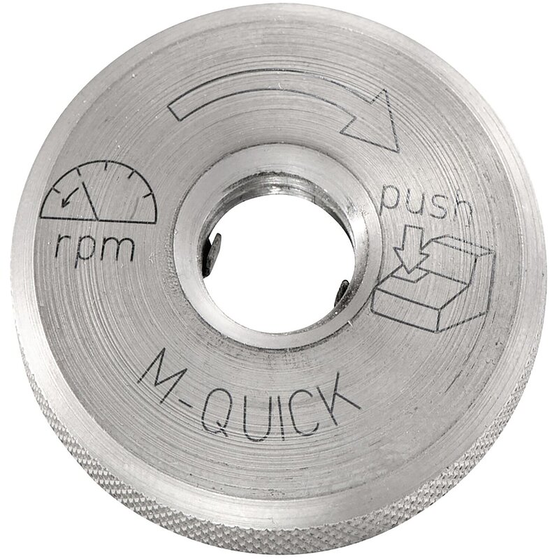 Speziell für Metabo Quick-System zum werkzeuglosen Scheibenwechsel auf Knopfdruck. Passend für alle kleinen Metabo Winkelschleifer mit M-Quick Spindelknopf, außer W 6-115, W 6-125, WB 11-125, erforderlicher Gewindeanschluss M 14.