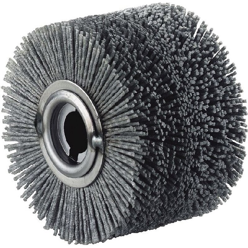 Elastische, korndurchsetzte Rundbürste zum Aufrauen und Entgraten von Metallen, für Rustikaleffekte an Holz.