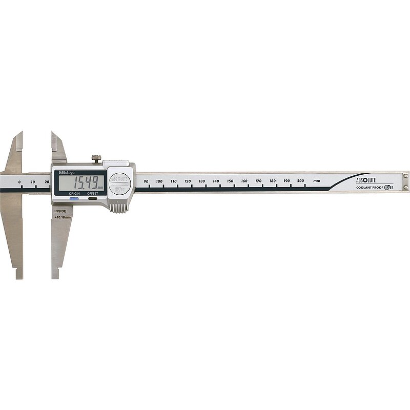 Absolute Digimatic Messschieber mit schneidenförmigen Messflächen zur Aussenmessung und mit gerundeten Messflächen zum Messen von Innenmaßen.