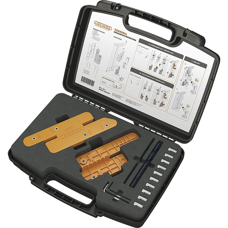 Werkzeugkoffer mit Set zum Bohren der Löcher bei der Installation von Selbstschließenden Türband Tiger und dem Puma- Torband. Montage: Tool befestigen, bohren, Tiger einbauen und fertig.