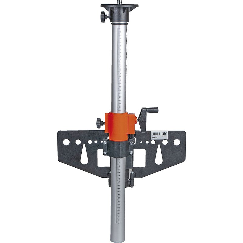 Universal-Halterung für alle Baulaser. Durchdachtes Designs mit hoher Standsicherheit, zur Anbringung eines Rotationslasers an Gebäudeteilen. Die Anbringung erfolgt mittels Bau-Schraubzwinge oder Ankerstab, per Verschraubung oder mit einem Spanngurt an Säulen, Trägern oder Pfosten. Sicherer Halt auf ebenen Flächen oder beim Über-Eck Einsatz dank beweglichen Flügeln. Integrierte prismenförmige Aufnahme zur sicheren Fixierung an runden Baustützen. Robuster Stativteller aus Aluminium mit 5/8" Anschlussgewinde. Einstellung der Arbeitshöhe per Kurbelsäule mit indirektem Kurbelantrieb.