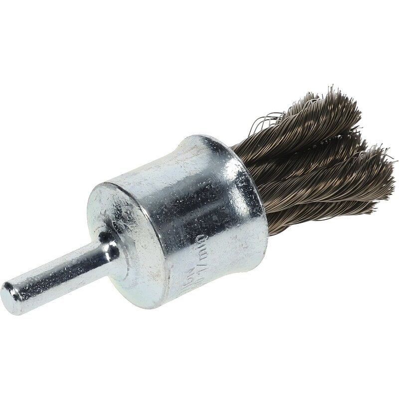 Gezopfte Pinselbürste in Industriequalität für den Einsatz auf schnelllaufenden Maschinen. Der Durchmesser der Bürste verändert sich mit zunehmender Arbeitsdrehzahl; die Bürste spreizt sich auf, so dass sich unterschiedliche Bohrungsdurchmesser bearbeiten lassen. Zum Entrosten, Entlacken, Entgraten, Schweißnähte.