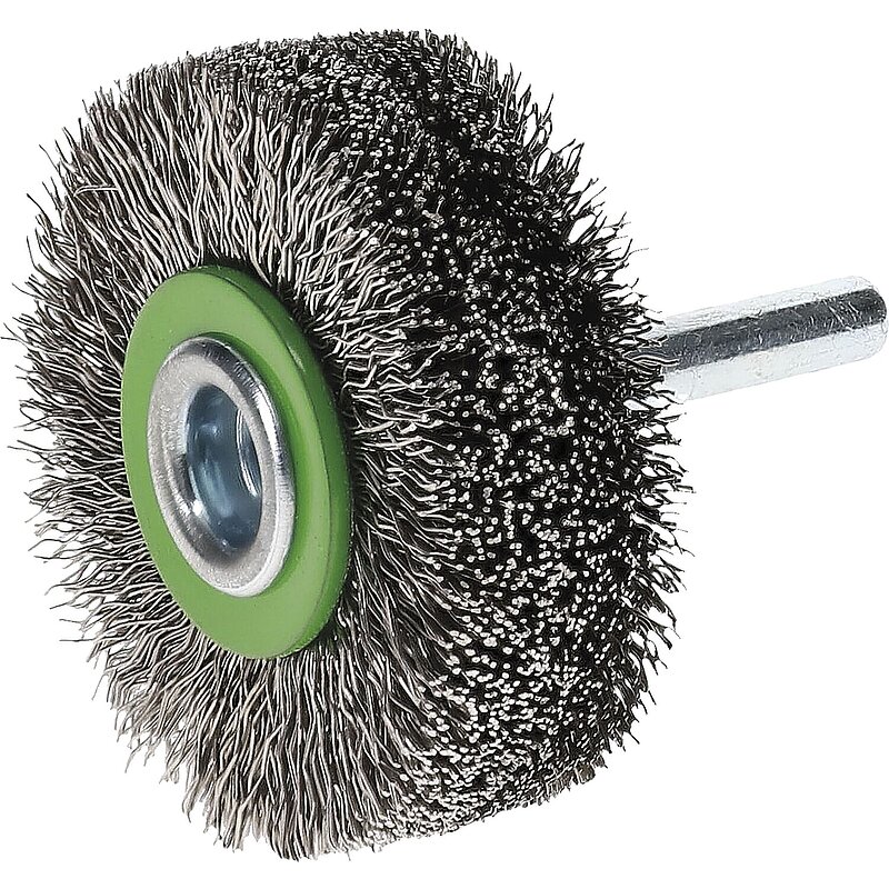Gewellte Rundbürste in Industriequalität für den Einsatz auf Bohrmaschinen und schnelllaufenden Maschinen. Zum Bearbeiten von Bohrungen, Kanten verrunden, Entgraten und leichte Reinigungsarbeiten.