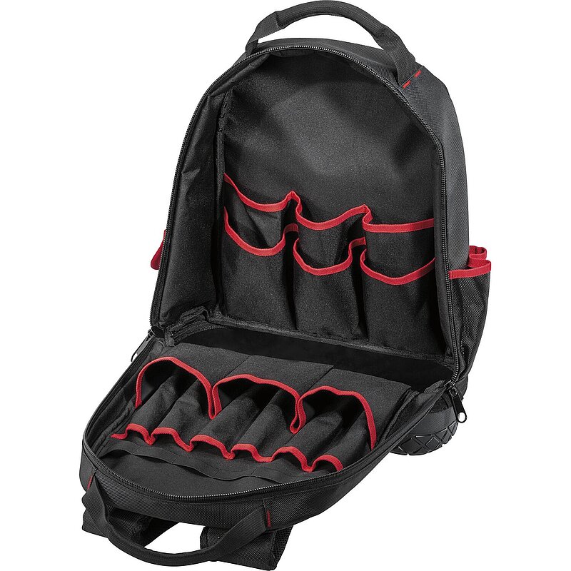 Im praktischen Werkzeugrucksack BASIC Backpack finden bis zu 50 Werkzeuge in 15 Einsteckfächern, 6 Gummischlaufen und 4 weiteren großzügigen Staufächern sowie ein Laptop bis 14" in separatem Fach ihren Platz. Zusätzlich sorgen ein separater Maßbandhalter und ein Schlüsselanhänger für Ordnung. Der Rucksack BASIC Backpack besteht aus hochwertig verarbeitetem Nylon. Der kunststoffverstärkte Boden schützt vor Abnutzung und macht den Rucksack extrem langlebig. Zudem lässt sich der Werkzeugrucksack BASIC Backpack durch die gepolsterte Rückwand und den gepolsterten Schulterriemen bequem transportieren.