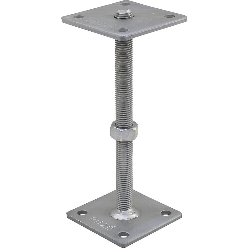 Pfostenträger verstellbar mit Gewindestangen zum Aufdübeln sind zur Aufnahme von vertikalen und horizontalen Lasten geeignet. Obere Platte auf Anfrage mit Mutter verschweißt, oder mit Sicherungslasche erhältlich.