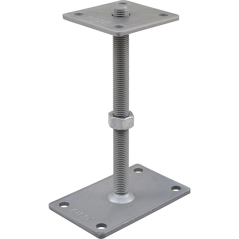 Pfostenträger verstellbar mit Gewindestangen zum Aufdübeln sind zur Aufnahme von vertikalen und horizontalen Lasten geeignet. Obere Platte auf Anfrage mit Mutter verschweißt, oder mit Sicherungslasche erhältlich.