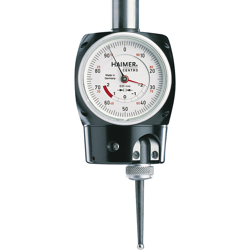 Mit nichtdrehender Uhr zum Ausmitteln von Bohrungen und Wellen. Auch zum Überprüfen oder Einstellen des Planlaufes geeignet. Sobald die Zeiger der Messuhr nicht mehr ausschlagen, befindet sich die Spindelachse exakt an der gesuchten Achse der Welle oder Bohrung. Gehäuse-ø 80 mm, Messuhr-ø 60 mm, Länge (ohne Einspannschaft) 92 mm.