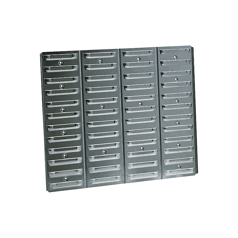 Geringes Eigengewicht und handliche Größe der Paneele erleichtert Ihnen die Montage, die einheitliche Größe der Raaco Paneele ermöglicht Sichtboxen-Wände und Lochpaneele zu kombinieren, die vielen Schlitze ermöglichen ein variables Anordnen aller Sichtboxen, galvanisiert. Mit 48 Schlitzen.
