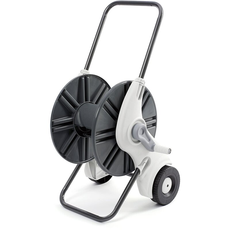 Mit diesem Schlauchwagen können bis zu 60 m eines 1/2" und bis zu 30 m eines 3/4" Wasserschlauches aufgewickelt werden. Bügel und Standfuß sind aus lackiertem Stahl, die Seitenscheibe aus Kunststoff. Der Griff ist höhenverstellbar und verspricht dadurch bequemes Arbeiten im Garten.