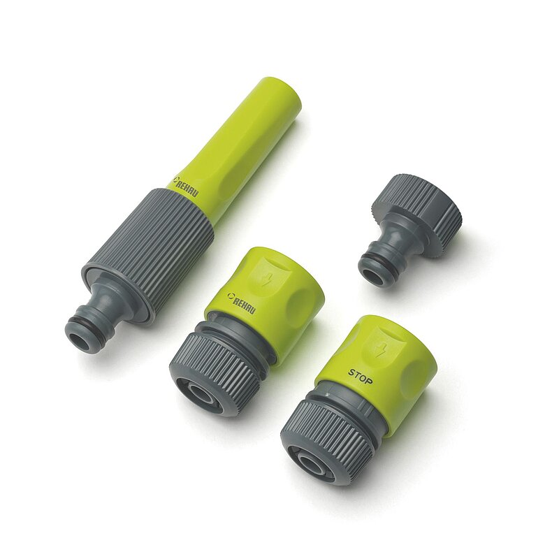 Bestehend jeweils aus Hahnanschluss (3/4" mit Reduzierstück auf 1/2"), Schnellschlauchstück, Wasserstop und Spritze, kompatibel zu allen marktüblichen Kunststoff-Systemen. Grundausstattung 1/2" auch geeignet für den Anschluss von 5/8"-Schläuchen.