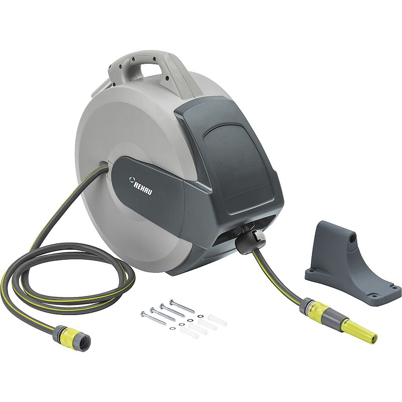 Mit der flexiblen REHAU Schlauchbox ist ein schneller, bequemer und sauberer Schlaucheinsatz garantiert. Die integrierte Technik der Schlauchbox sorgt für eine komfortable Handhabung des Schlauches: Schlauch einfach auf die gewünschte Länge ausziehen und durch kurzes Ziehen die Arretiervorrichtung aktivieren. Nach dem Bewässern reicht ein erneuter Zug am Schlauch und dieser rollt sich automatisch wieder in die Schlauchbox auf. Die REHAU Schlauchbox lässt sich durch die mitgelieferte Halterung einfach an der Wand befestigen und ist so um 180° schwenkbar. Dies erlaubt den flexiblen Einsatz in jede beliebige Richtung. Der an die Schlauchbox angebrachte Haltegriff ermöglicht einen komfortablen Transport, z.B. bei der Demontage vor dem Winter.