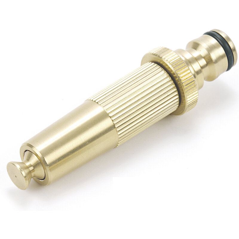 Messing-Klick. Ist vom Sprüh- bis zum Vollstrahl stufenlos verstellbar.