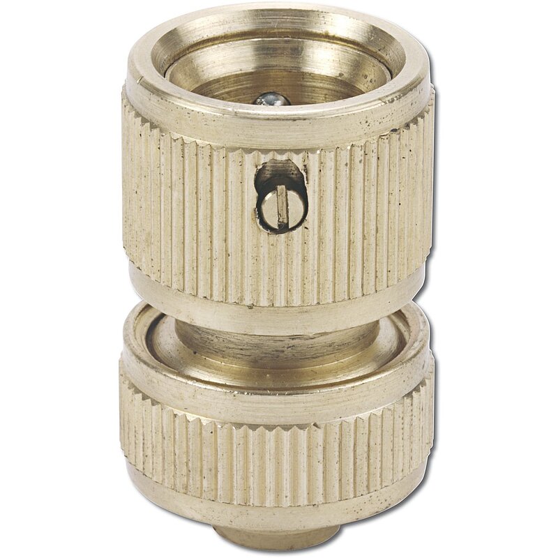 Messing-Wasserstop am Schlauchende. Beim Kuppeln wird der Wasserdurchfluss automatisch gestoppt bzw. freigegeben. Somit entfällt der Gang zum Wasserhahn beim Gerätewechsel.