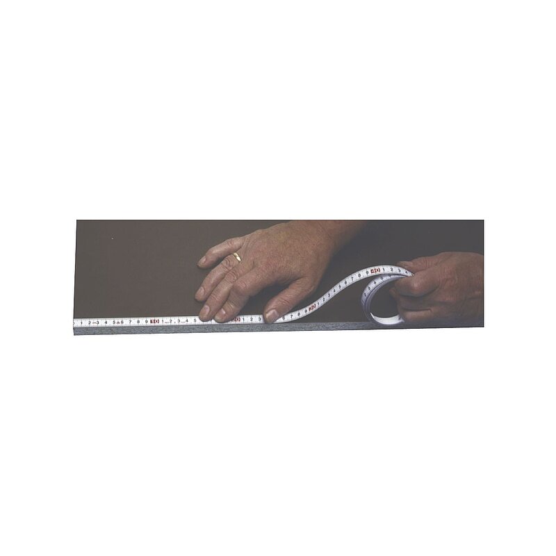 Aus Stahl, zweifarbig bedruckt, mm-Teilung an Ober- und Unterkante in schwarz, fortlaufende Zentimeterbezifferung in schwarz, Dezimeterzahlen in roter Farbe. Die beschichtete Rückseite klebt auf fast allen Oberflächen.