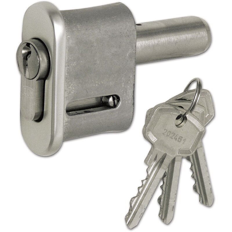 Dieser Verschluss entspricht einem Bedürfnis der Praxis, hintereinander laufende Doppelschiebetore mit einem schweren Riegelverschluss zuverlässig sichern zu können. Zylinder mit 5 Stiftzuhaltungen, Hartbronze- Spezialkernstift, Bronzefedern, Doppelnachschließsicherung, Anbohrsicherung, Messing- Rundriegel mit gehärteter Stahlseele (verhindert ein Durchsägen des Riegels). Gehäuse aus Leichtmetallguss mit Profil- Halbzylinder (nicht austauschbar), Riegelausschluss nach rückwärts, Hub ca. 22 mm, leichter Einbau mit Schablone, Befestigung von rückwärts mit 2 Schrauben.