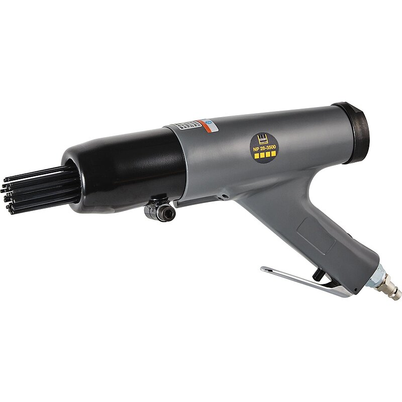 Sehr robuster Nadelentroster mit langlebigen Schlag-Mechanismus für härtesten Einsatz überwiegend im Bauhandwerk. Verstellbares Nadelrohr ermöglicht variablen Einsatz des Werkzeugs, z.B. abklopfen von Rost, Farbe und Schweißschlacke sowie zur Steinbearbeitung. Gehärtete Nadeln aus Spezialstahl für lange Standzeit und hohen Abtrag. Flexilbe Nadelführung, die Nadeln passen sich unebenen Flächen perfekt an.