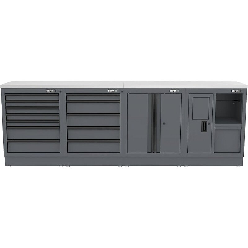 Die Kombi-Werkbank vereint Funktionalität und Qualität in einem durchdachten Design. Sie ist die ideale Lösung für alle, die Wert auf Ordnung, Stabilität und eine ergonomische Arbeitsfläche legen. Massive Holzplatte aus hochwertigem Kautschukbaumholz – widerstandsfähig, langlebig und angenehm in der Haptik. Praktische Schubladen in unterschiedlichen Höhen (schmale Schubladen für Kleinteile, hohe Schubladen für größere Werkzeuge) – alle mit Vollauszug und Softclose für maximalen Zugriff. Geräumige Schränke mit stabilen Fachböden – perfekt für die übersichtliche Lagerung von Maschinen und Zubehör. Robuste Konstruktion für hohe Belastbarkeit und sicheren Stand – ideal für den täglichen Einsatz in Werkstatt oder Produktion. Zusätzlich mit integriertem Mülleimer und Papierrollenhalter.