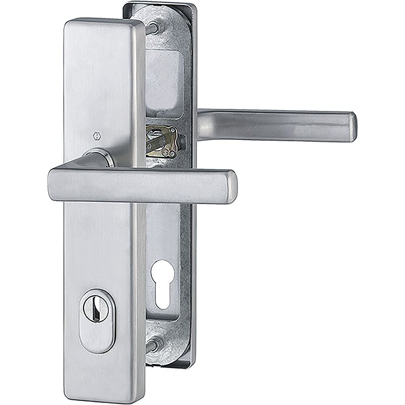 Sicherheits-Drückergarnitur DALLAS auf Langschild PZ 92, VK 10 mm,Edelstahl matt