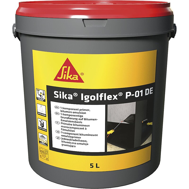 Sika® Igolflex® P-01 DE ist ein lösemittelfreier, verdünnbarer, sehr schnell trocknender Bitumenemulsions-Voranstrich als Grundierung vor kunststoffmodifizierten Bitumendickbeschichtungen (KMB/PMBC).