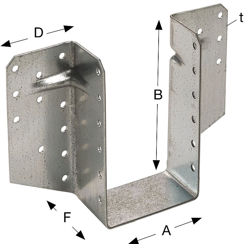 Anschluss von Nebenträger aus Holz oder Holzwerkstoffen an Hauptträger oder Stützen aus Holz oder Holzwerkstoffen. Aufgrund der zusätzlichen Verstärkungsrippen speziell geeignet für zweiachsige Belastung.