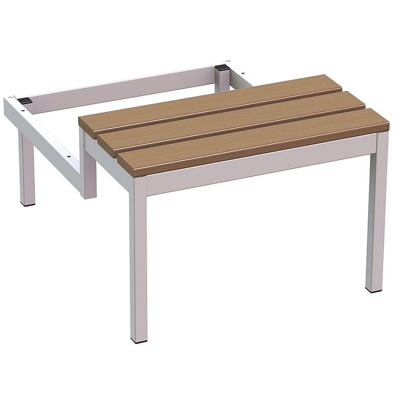 Tragende Sitzbank mit Struktur in Rohrstahl 30 x 30 mm, Sitzlatten aus Kernholz natürlich lackiert mit versteckter Fixierung. Bodengleiter aus Kunststoff.