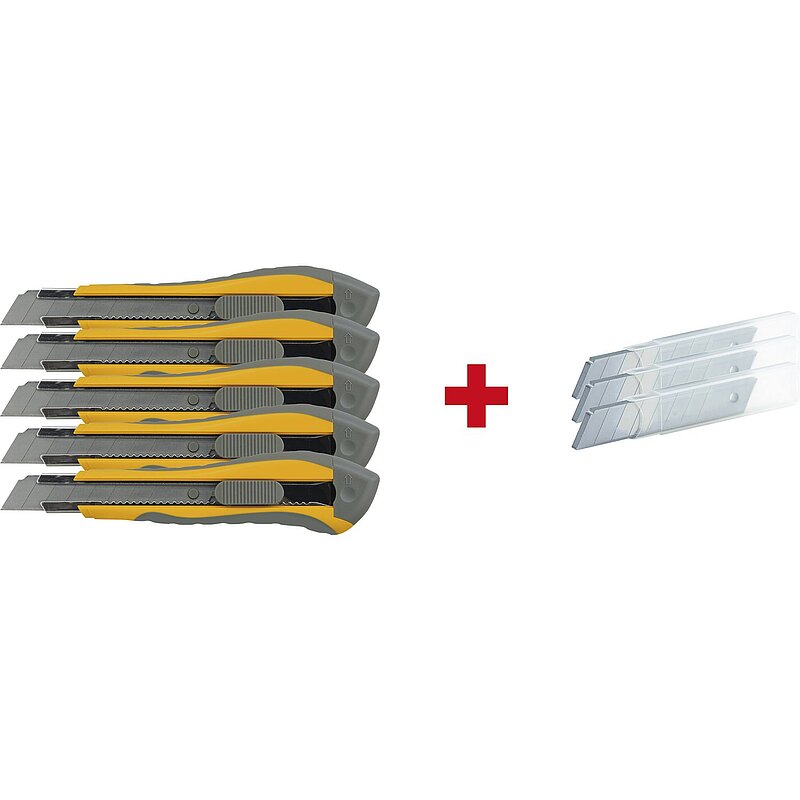 Lieferung inkl. 5 x Profi Automatik Cutter mit 18 mm Abbrechklinge, 3 x Ersatzklingenbox je 10 Stück.