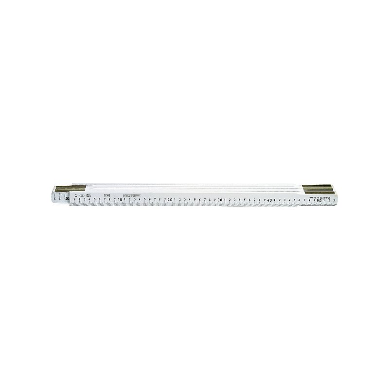 Aus Hartholz, weiß lackiert, widerstandsfähig, starke Federn aus Metall, sehr robuste Ausführung, schwarze mm-Duplexteilung an Ober- und Unterkante, dadurch sehr gut ablesbar, fortlaufende cm-Bezifferung auf beiden Seiten entgegenlaufend, große Bezifferung.